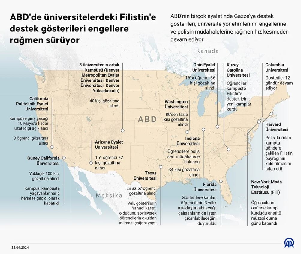 Öte yandan, Gazze’ye destek gösterilerine katılan öğrencilere “ceza” olarak okuldan uzaklaştırma veya yasal işlem uygulanmaya devam ederken, California, Georgia ve Texas üniversitelerindeki akademisyenler sembolik de olsa “üniversite yönetimine güvensizlik oylaması” düzenledi.