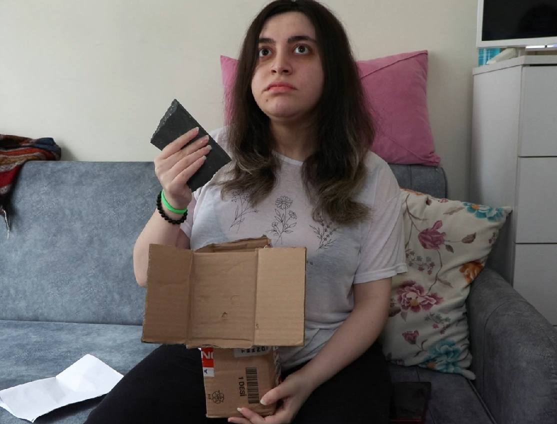 Bedensel engelli Sibel Zengin, “2 Şubat Cuma günü bir teknolojik mağazadan tablet satın alımı gerçekleştirdik. Cuma günü aldığımız için araya hafta sonu girdi. 5 Şubat’ta biz kargomuzu almak üzere; ben engelli olduğum için evden bizzat aile büyüğümden birini gönderdim. Onlar da gidip alıp getirdi. ‘Hayırlı olsun’ diyerek açmak istedi dayım. Açınca içinde kare şeklinde bir taş gördük.” dedi.